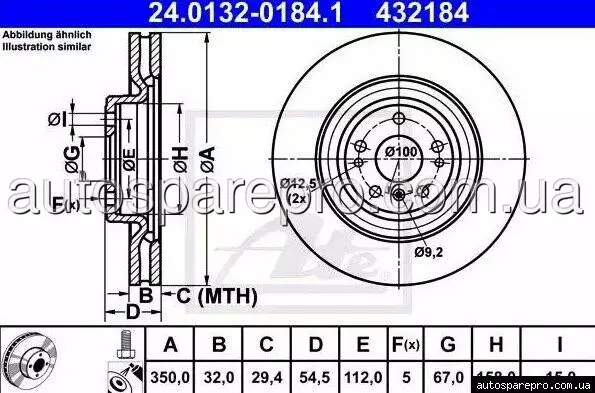 Гальмівний диск передній ATE 24013201841 – це високоякісна запчастина від німецького бренду ATE, відомого своєю експертизою у виробництві гальмівних систем. Цей вентильований диск, виготовлений із легованого/високовуглецевого матеріалу з покриттям, призначений для передньої осі автомобілів Мерседес ML/GLE (W166, C292), GL (X166) та GLS (X166). Диск має діаметр 350 мм, товщину 32 мм (мінімальна товщина 29.4 мм), діаметр фаски 112 мм, діаметр центрування 67 мм, внутрішній діаметр 158 мм, висоту 54.5 мм, 5 отворів і діаметр отвору 15 мм. Виріб постачається з гвинтами та має перевірочне значення E1 90R-02C0115/1329. Стан – новий, не перфорований.