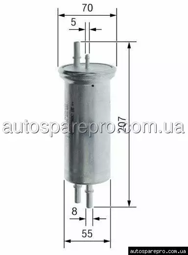 Модель Bosch F 026 403 000 має прямоточне виконання з алюмінієвим корпусом, стійким до високого тиску та корозії. Фільтр забезпечує тонке очищення бензину від мікрочасток бруду, іржі та опадів, що запобігає засміченню форсунок та зносу паливного насоса. Габарити фільтра (висота 207 мм, основний діаметр 70 мм) та патрубки під діаметр 8 мм забезпечують ідеальну посадку в штатне місце без додаткових модифікацій.