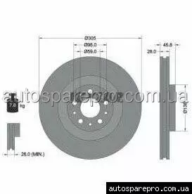 Розміри: Діаметр 305 мм, товщина 28 мм (мінімальна товщина 26 мм), висота 45,8 мм, діаметр центрування 59 мм.