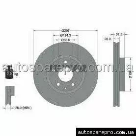 Гальмівний диск має зовнішній діаметр 297 мм та товщину 28 мм, при цьому мінімально допустима товщина становить 26 мм. Для підвищення зносостійкості та захисту від іржі на неробочих поверхнях диск покритий спеціальним захисним покриттям. Диск має 5 отворів для кріплення колеса (діаметр фаски 114,3 мм) та діаметр центрування 68 мм. Комплект постачається без додаткових компонентів, таких як маточина, колісний підшипник чи кріпильна вісь. Використання дисків Textar PRO+ гарантує максимальну ефективність гальмування та надійність.